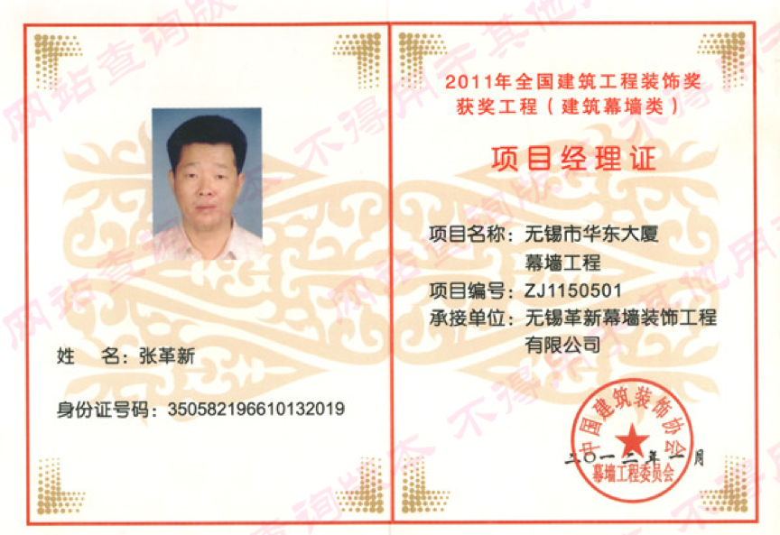 喜訊:熱烈祝賀我公司法定代表人張革新同志獲“2011年全國(guó)優(yōu)秀項(xiàng)目經(jīng)理(建筑幕墻類)項(xiàng)目經(jīng)理證”稱號(hào)